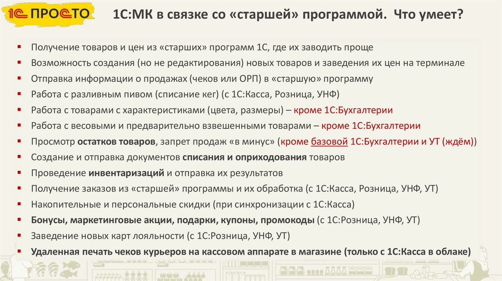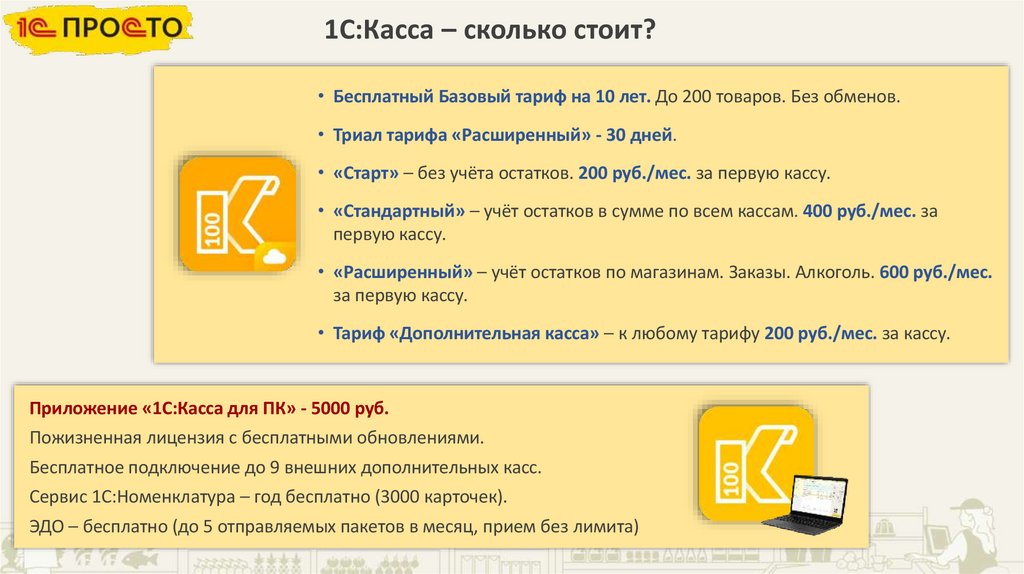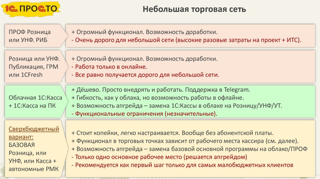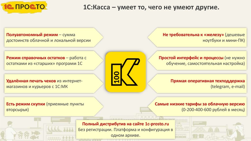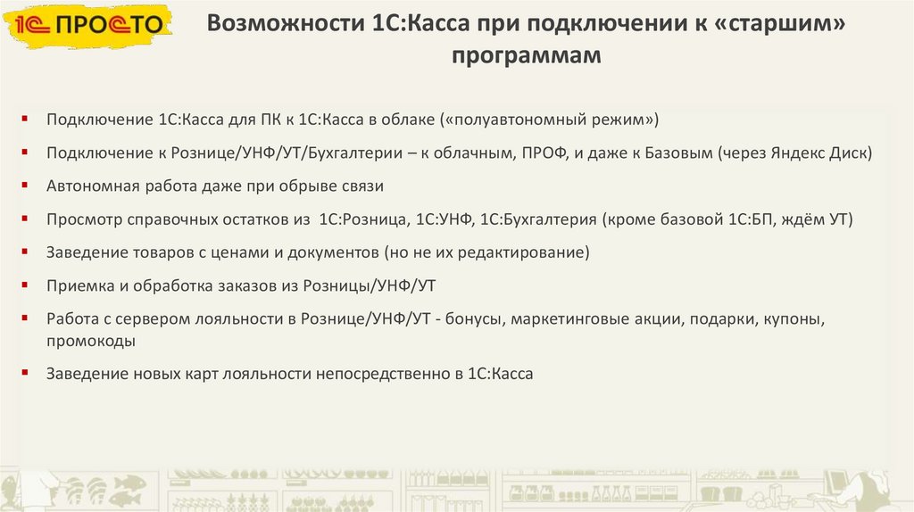 + Возможность апгрейда – замена 1С:Кассы в облаке на Розницу/УНФ/УТ.