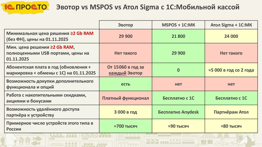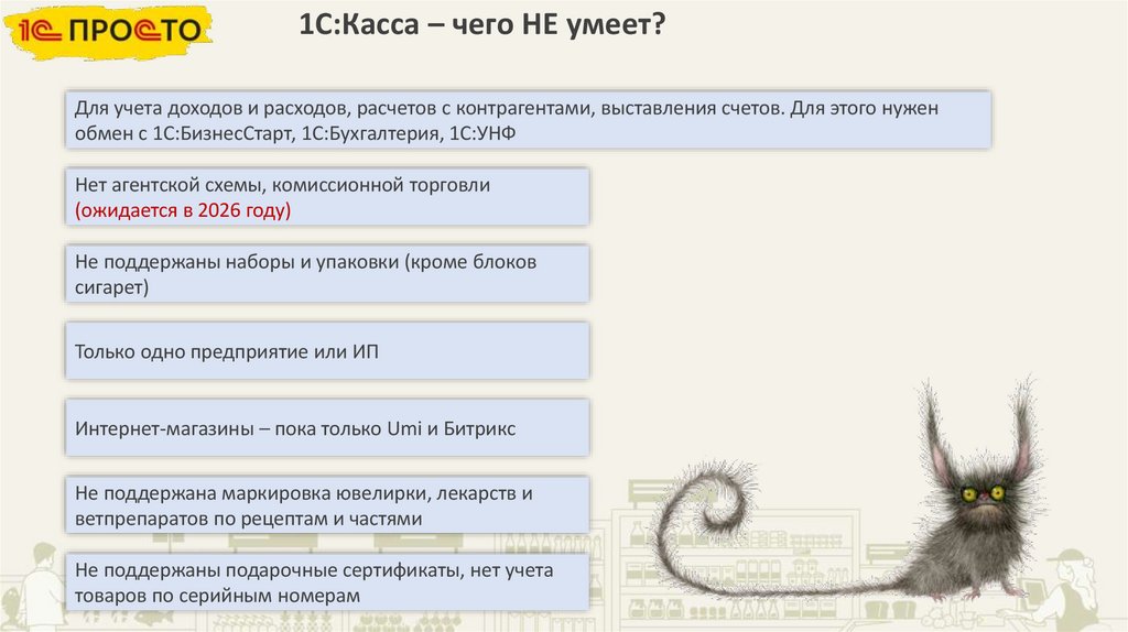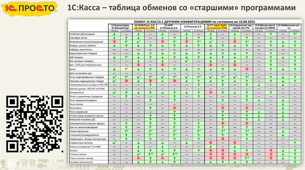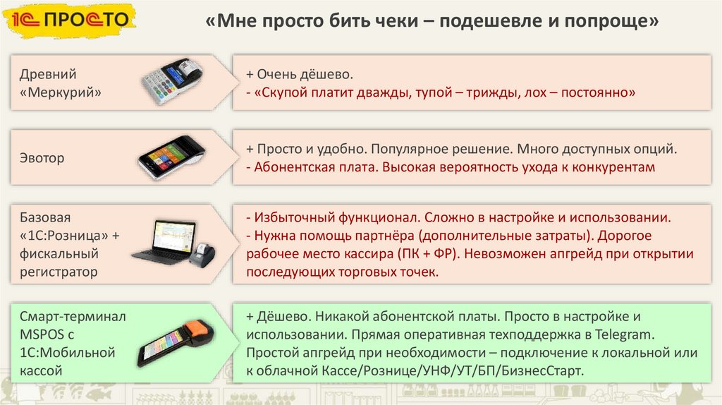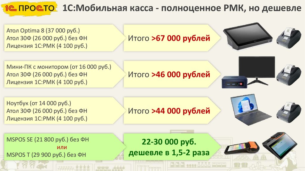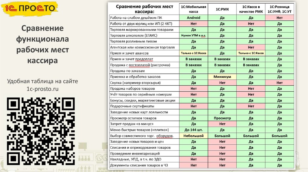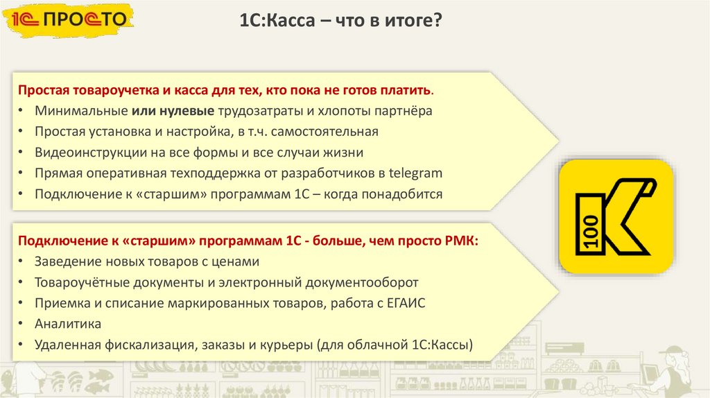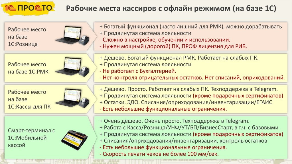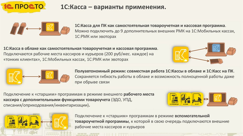 + Есть возможность апгрейда – подключить 1С:Кассу к «старшему» ПО или к облаку.