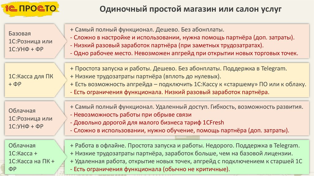 - Одно рабочее место. Невозможен апгрейд при открытии новых торговых точек.