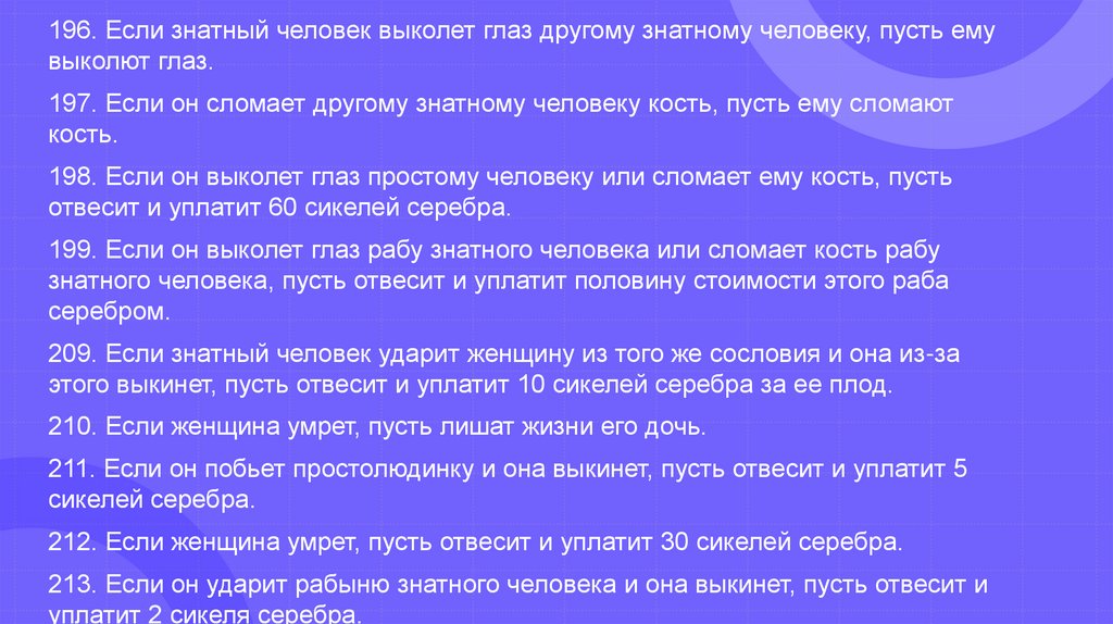 196. Если знатный человек выколет глаз другому знатному человеку, пусть емувыколют глаз.