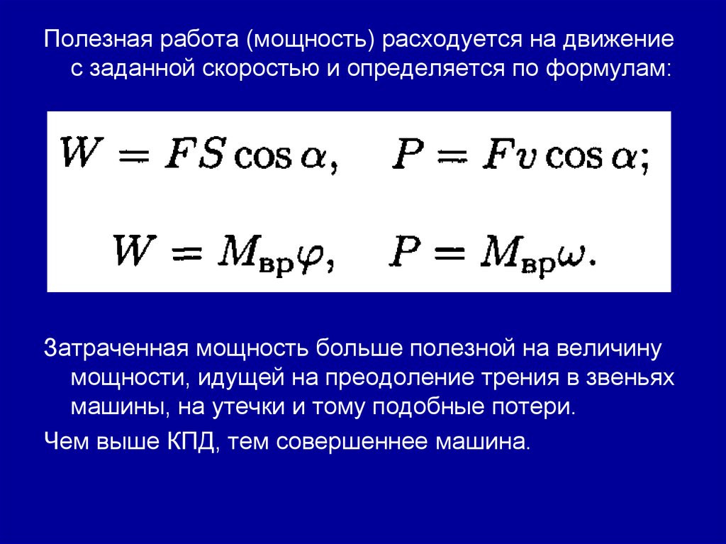 Полезная работа (мощность) расходуется на движениес заданной скоростью и определяется по формулам:
