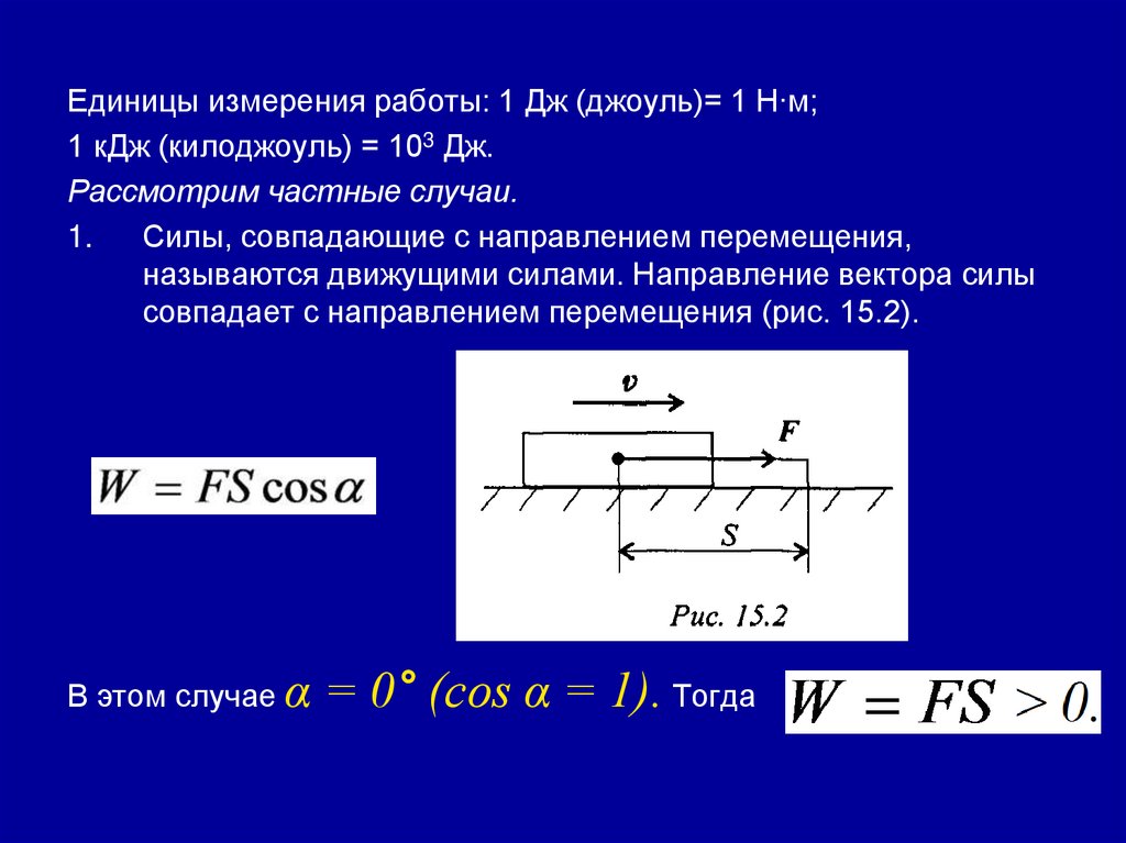 Единицы измерения работы: 1 Дж (джоуль)= 1 Н∙м;1 кДж (килоджоуль) = 103 Дж.