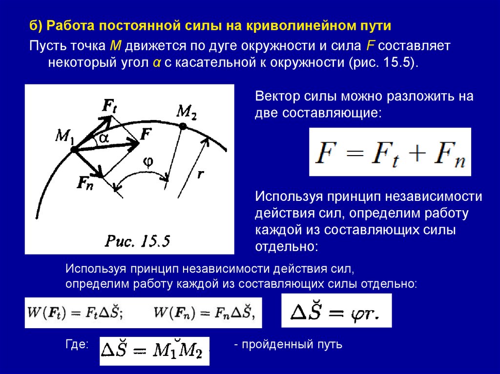 б) Работа постоянной силы на криволинейном путиПусть точка М движется по дуге окружности и сила F составляет