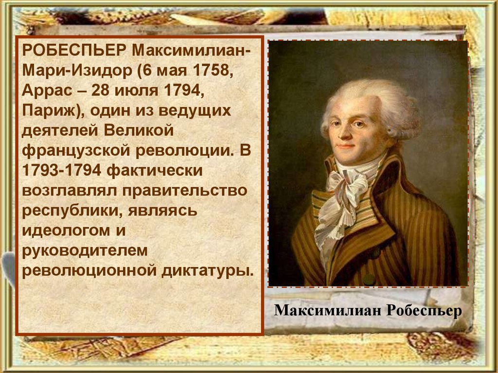 РОБЕСПЬЕР МаксимилианМари-Изидор (6 мая 1758,Аррас – 28 июля 1794,