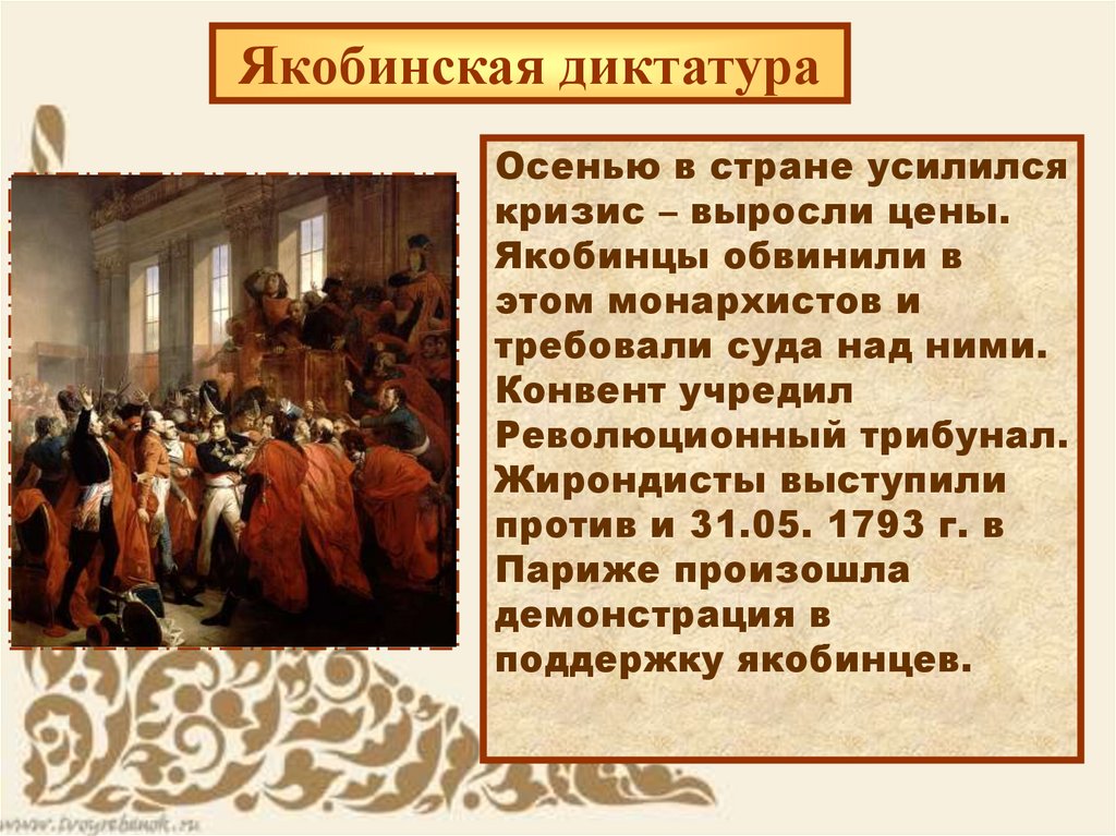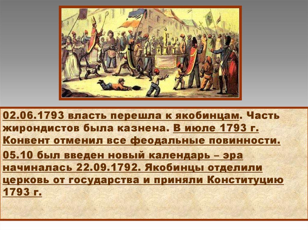 02.06.1793 власть перешла к якобинцам. Частьжирондистов была казнена. В июле 1793 г.