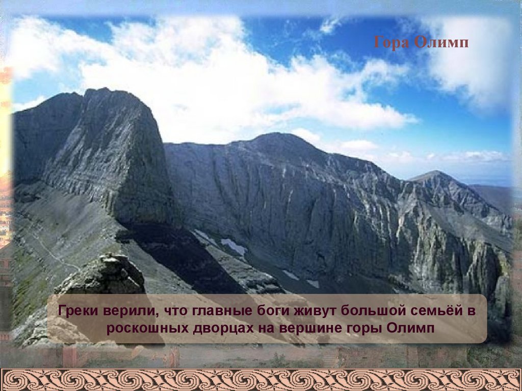 Гора ОлимпГреки верили, что главные боги живут большой семьёй в