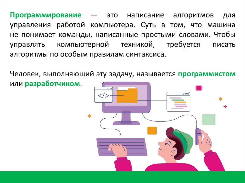 Программирование — это написание алгоритмов дляуправления работой компьютера. Суть в том, что машина