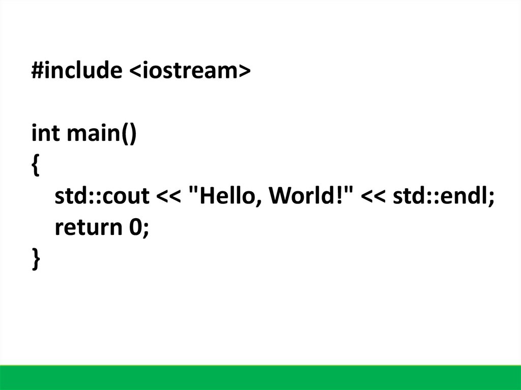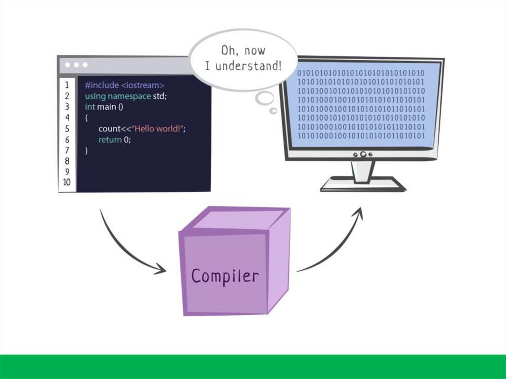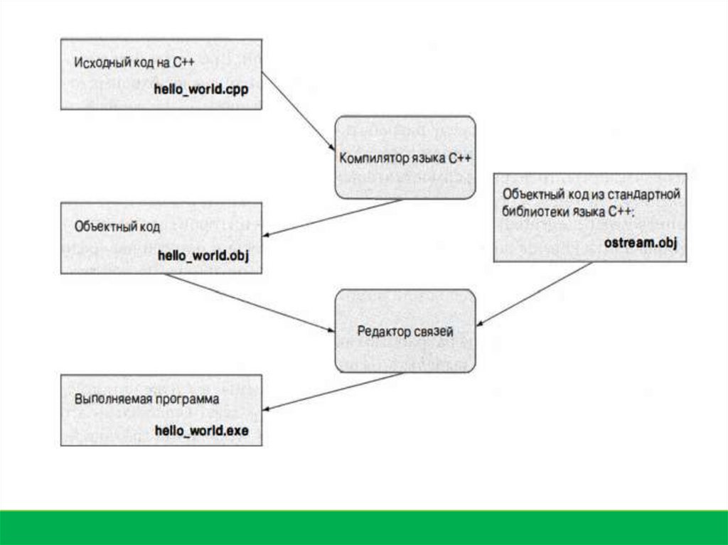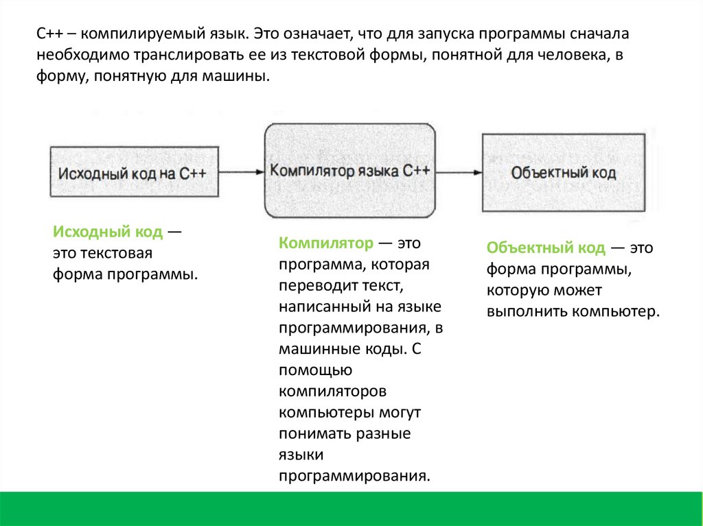 С++ – компилируемый язык. Это означает, что для запуска программы сначаланеобходимо транслировать ее из текстовой формы, понятной для человека, в