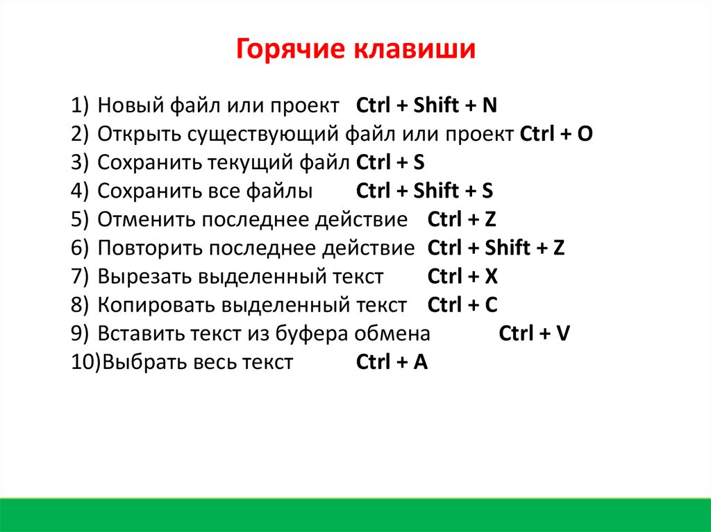 Горячие клавиши1) Новый файл или проект Ctrl + Shift + N