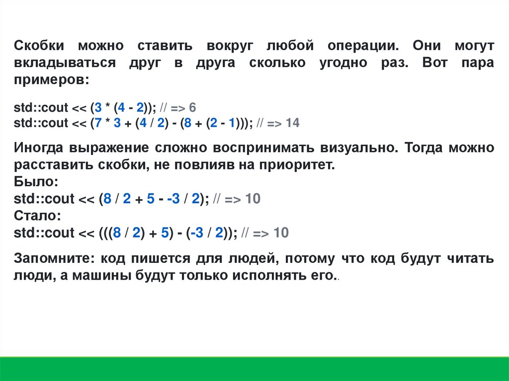 Скобки можно ставить вокруг любой операции. Они могутвкладываться друг в друга сколько угодно раз. Вот пара