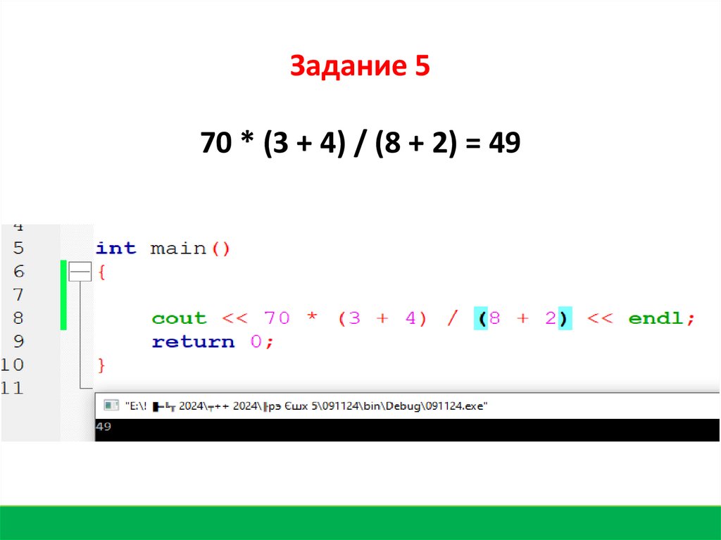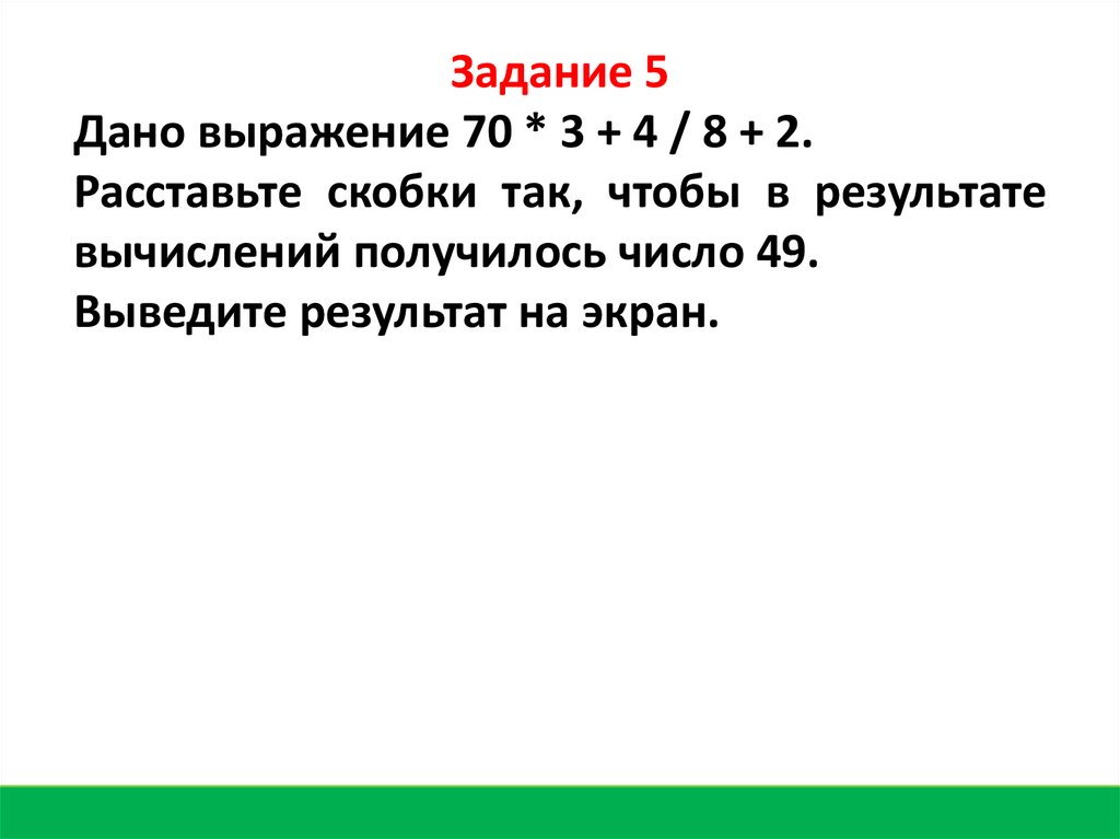 Задание 5Дано выражение 70 * 3 + 4 / 8 + 2.