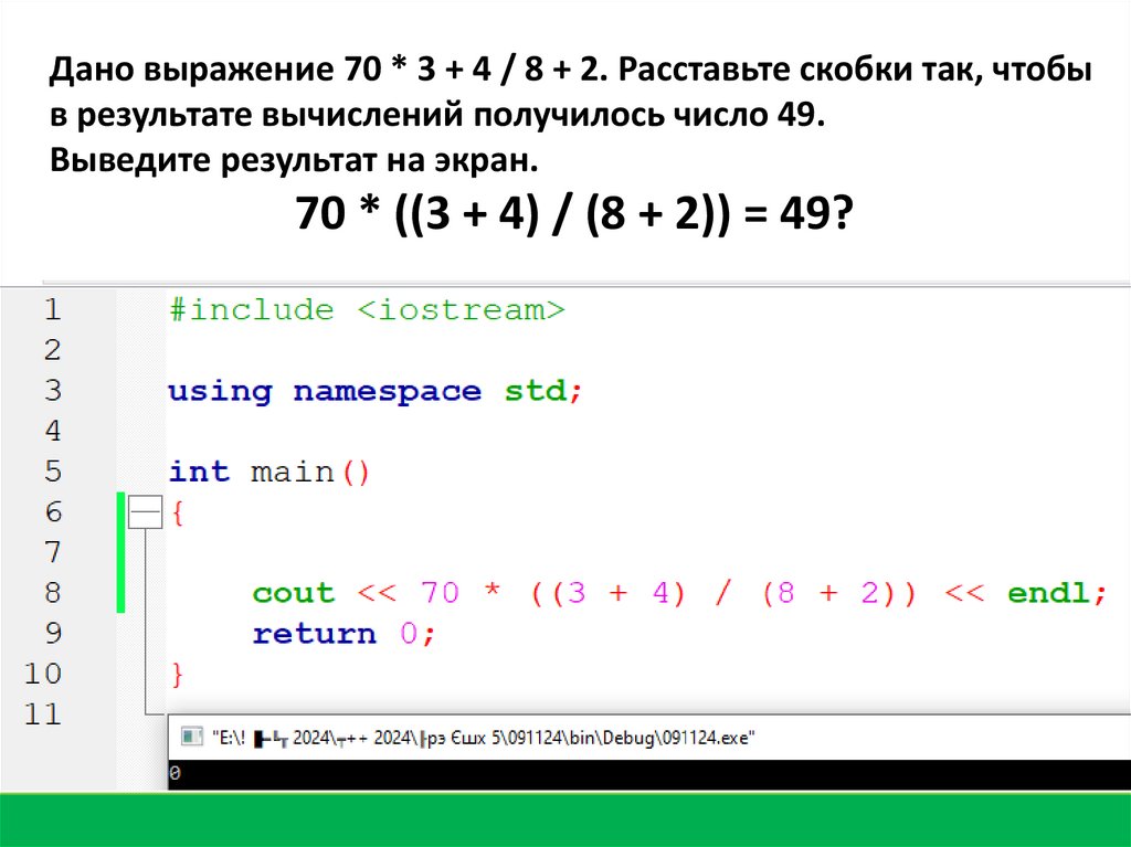 Дано выражение 70 * 3 + 4 / 8 + 2. Расставьте скобки так, чтобыв результате вычислений получилось число 49.