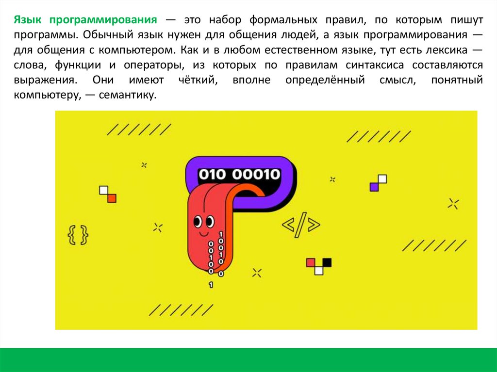 Язык программирования — это набор формальных правил, по которым пишутпрограммы. Обычный язык нужен для общения людей, а язык программирования —