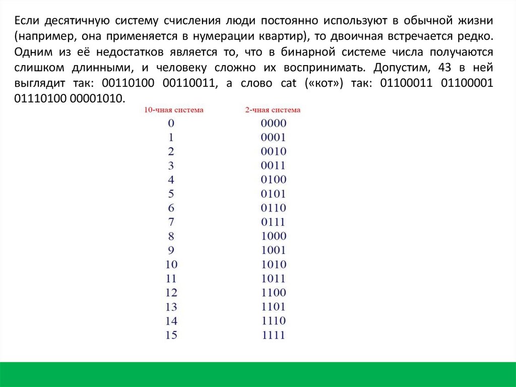 выглядит так: 00110100 00110011, а слово cat («кот») так: 01100011 01100001