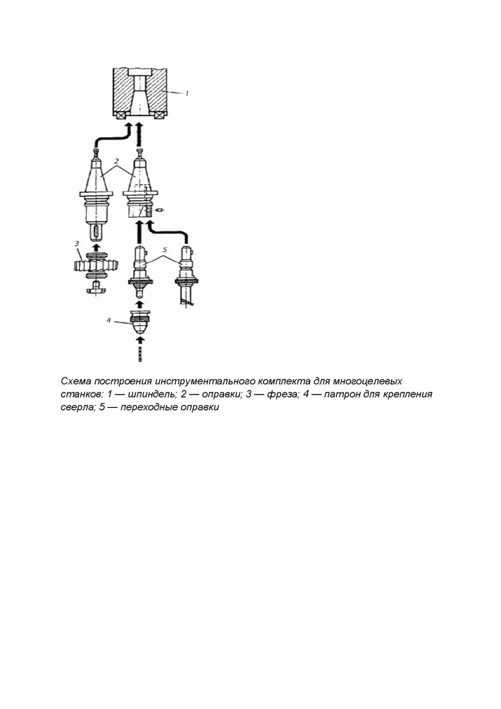 Схема построения инструментального комплекта для многоцелевыхстанков: 1 — шпиндель; 2 — оправки; 3 — фреза; 4 — патрон для крепления