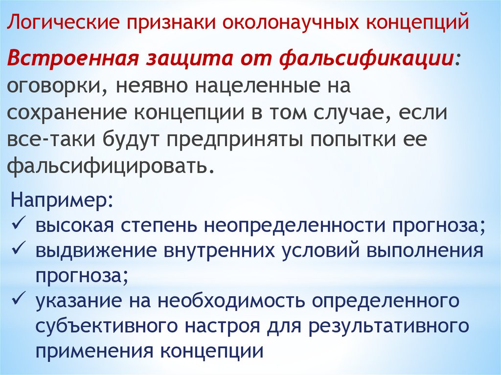 Логические признаки околонаучных концепцийВстроенная защита от фальсификации: