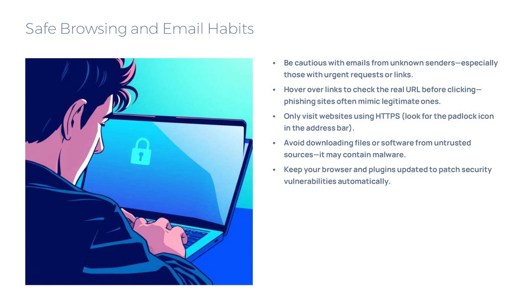 Safe Browsing and Email Habits• Be cautious with emails from unknown senders—especially