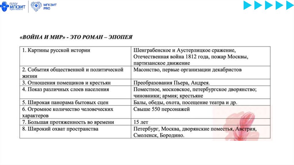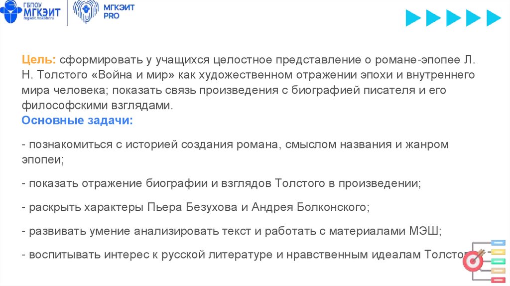 Цель: сформировать у учащихся целостное представление о романе-эпопее Л.Н. Толстого «Война и мир» как художественном отражении эпохи и внутреннего