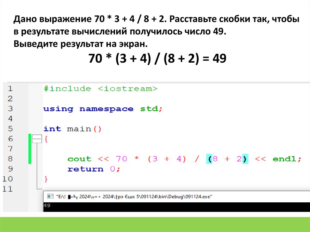 Дано выражение 70 * 3 + 4 / 8 + 2. Расставьте скобки так, чтобыв результате вычислений получилось число 49.