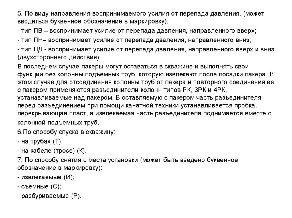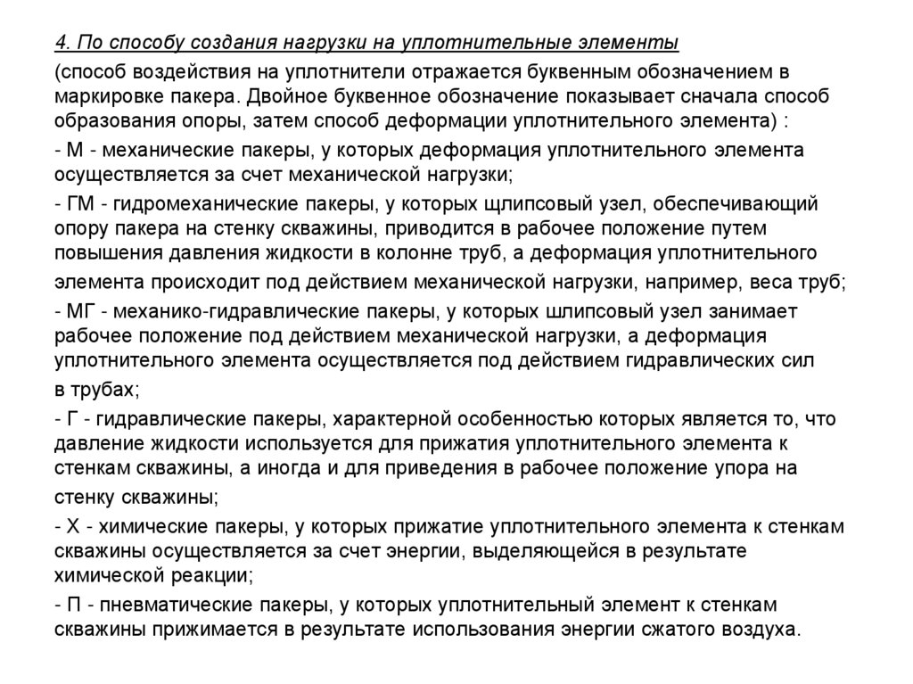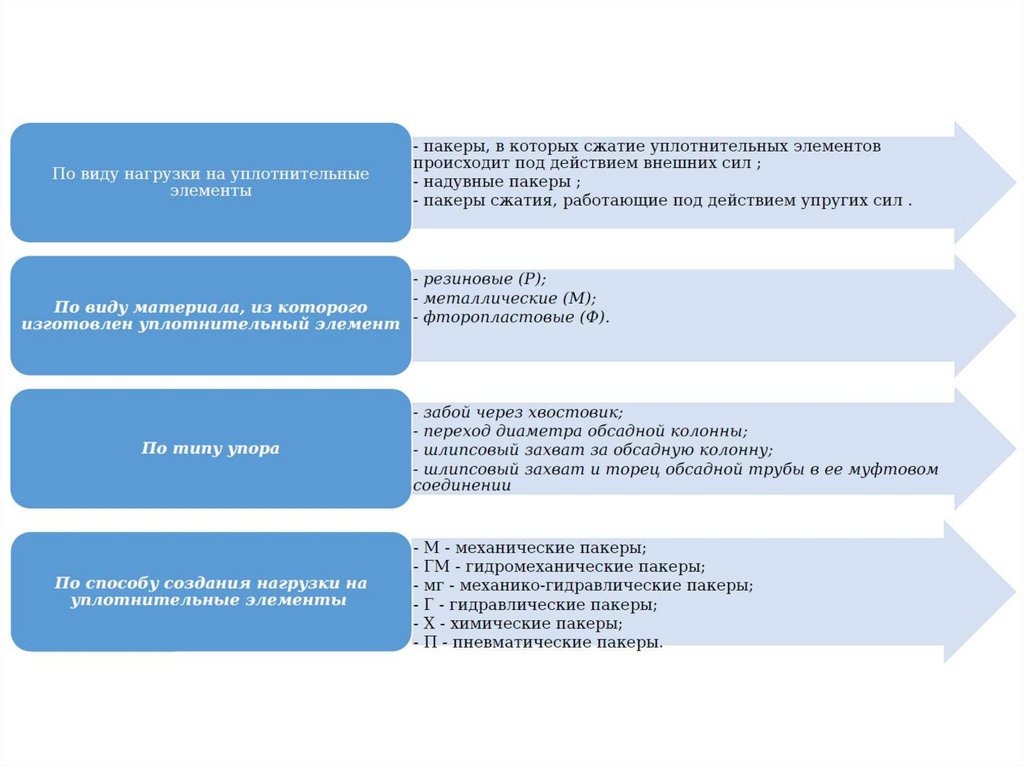 1. В соответствии с назначением пакеры (уплотнители) делятся на:- Уплотнители, применяемые при отборе нефти и газа из пласта
