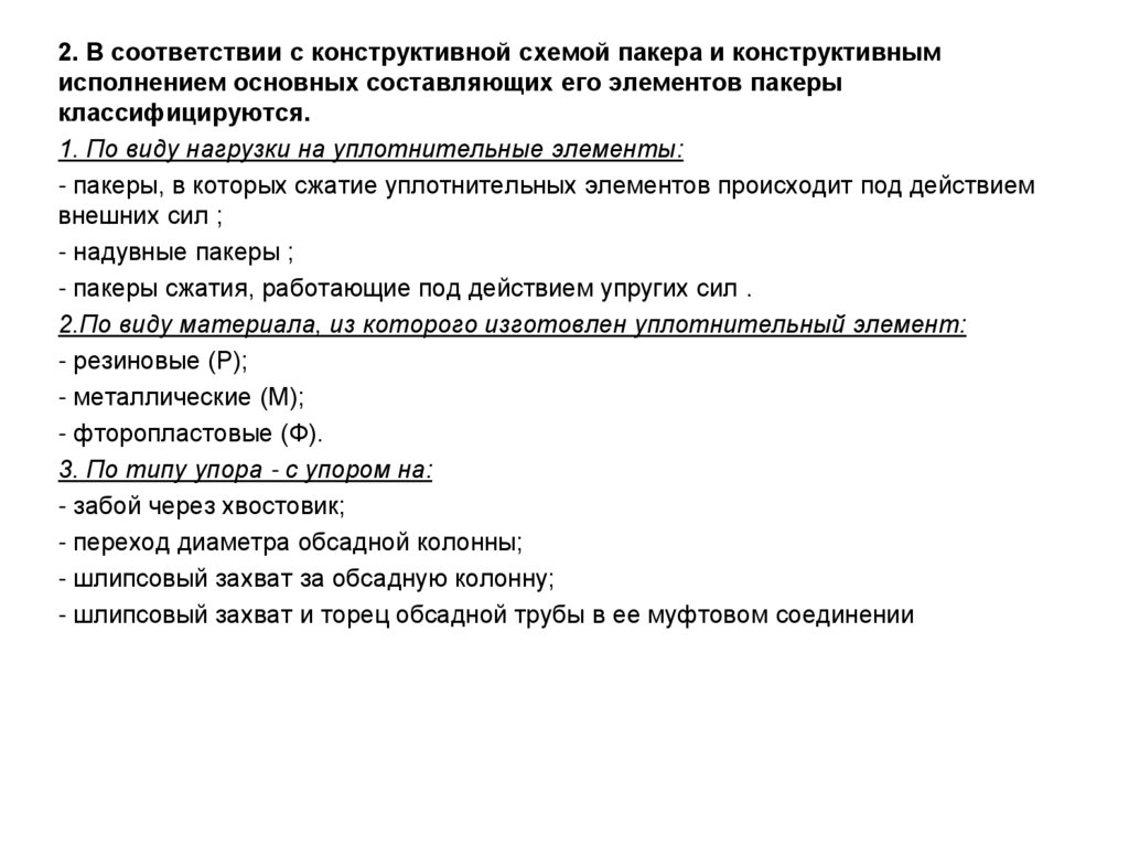 2. В соответствии с конструктивной схемой пакера и конструктивнымисполнением основных составляющих его элементов пакеры