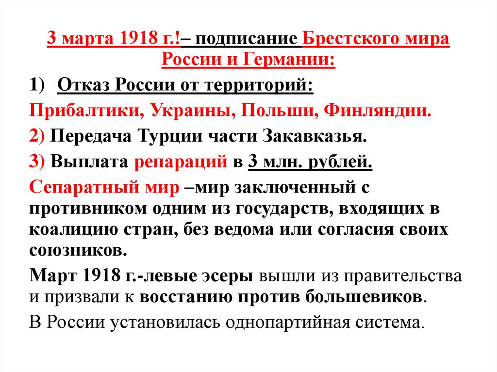 3 марта 1918 г.!– подписание Брестского мираРоссии и Германии: