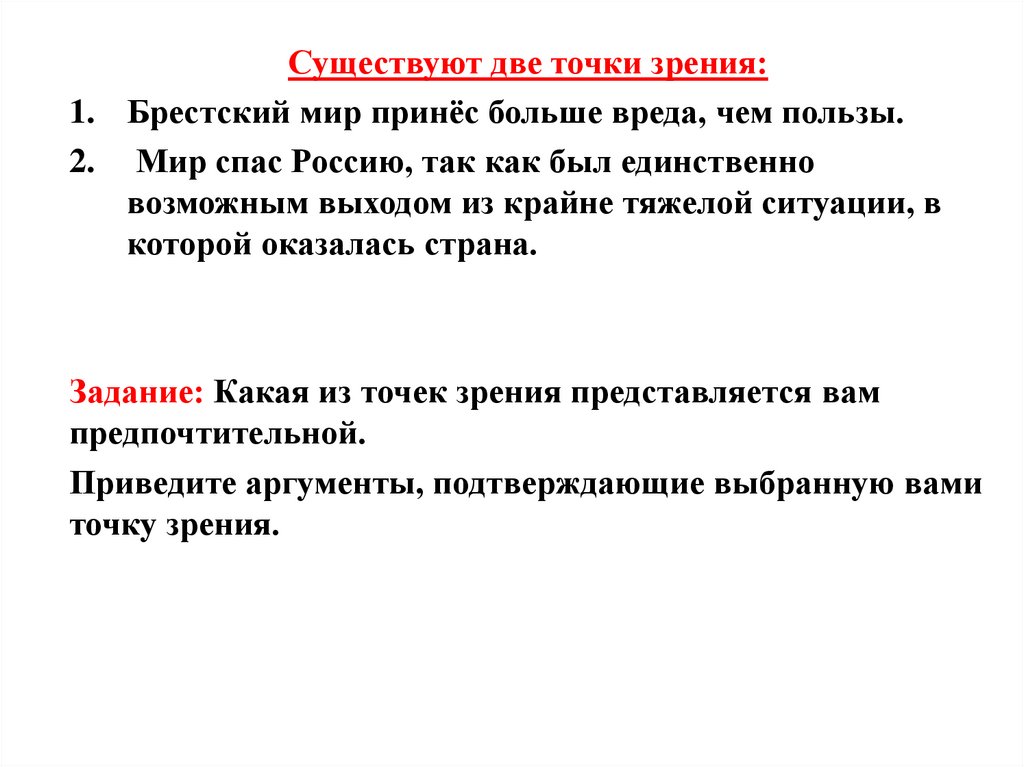 Существуют две точки зрения:1. Брестский мир принёс больше вреда, чем пользы.