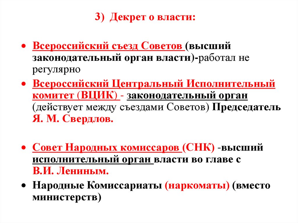 3) Декрет о власти:Всероссийский съезд Советов (высший