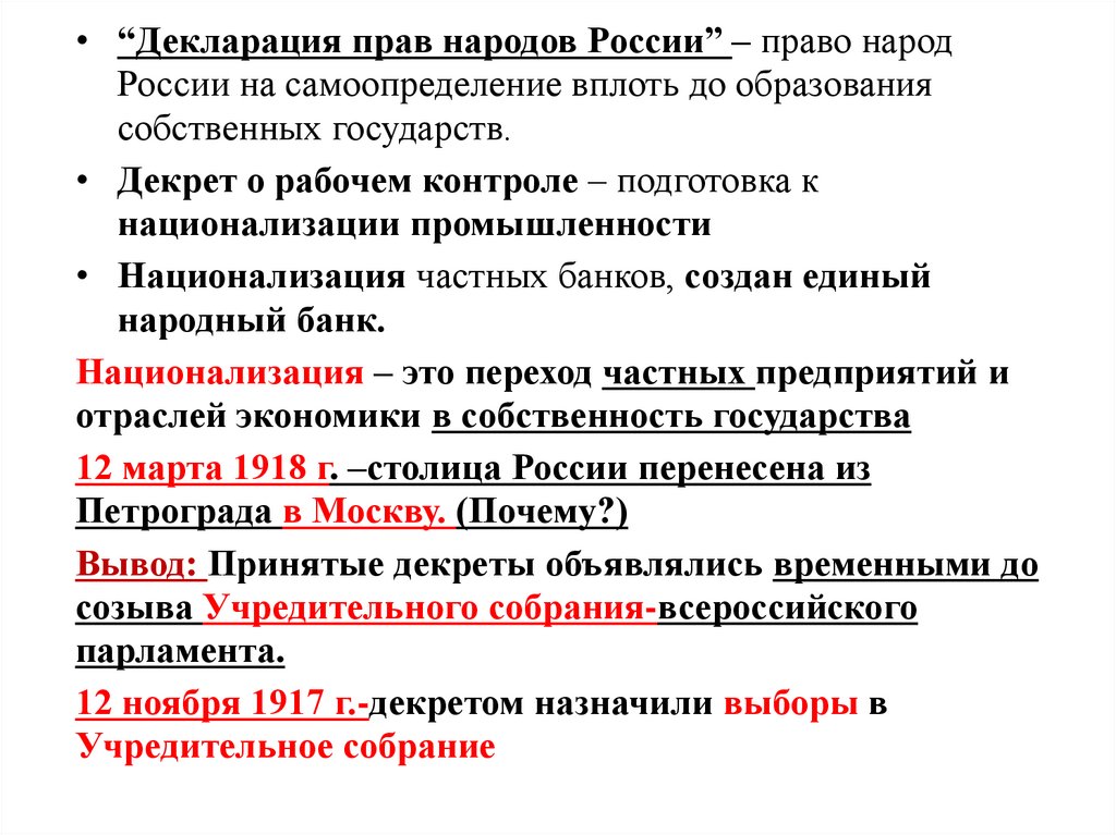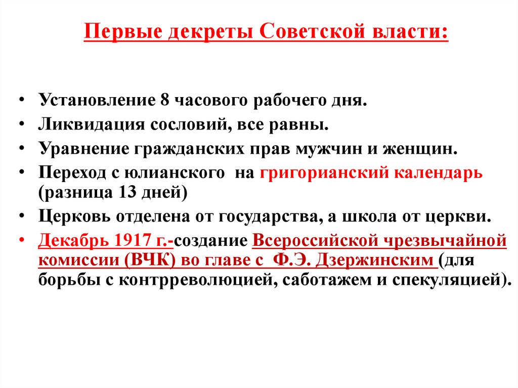 Первые декреты Советской власти:• Установление 8 часового рабочего дня.