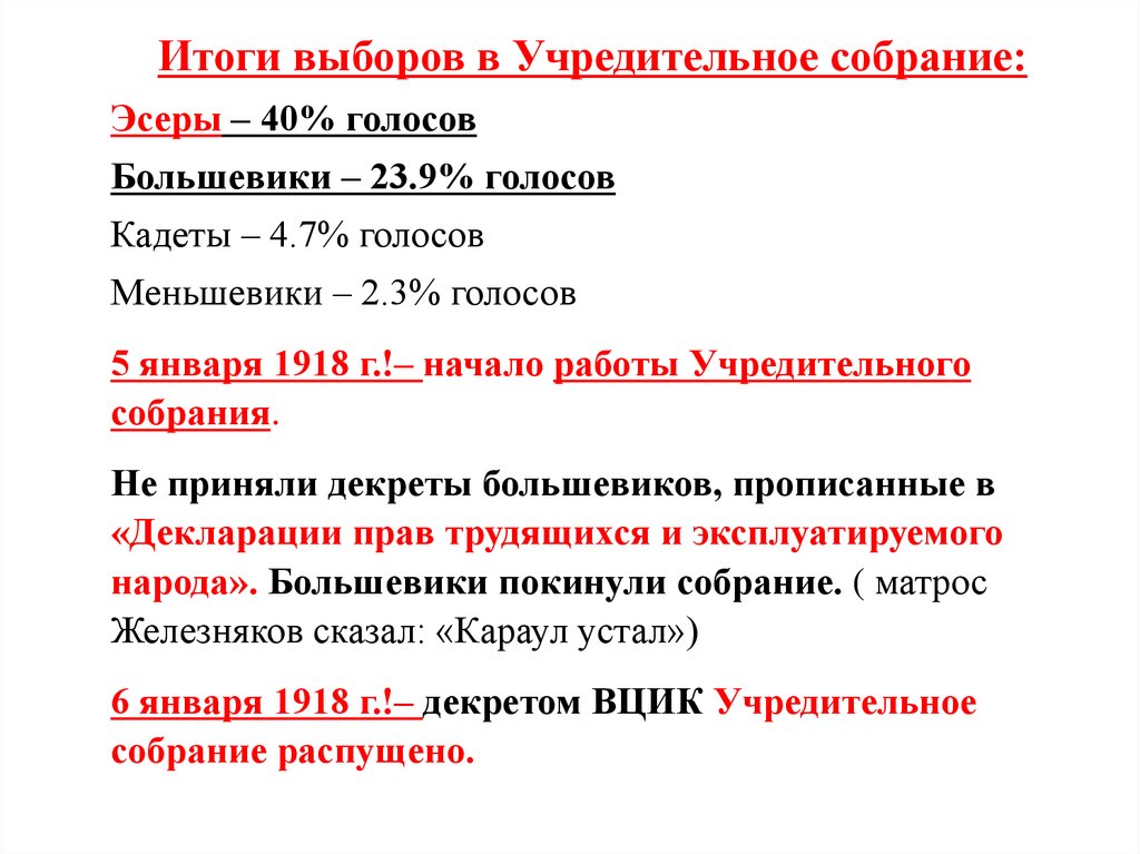 Итоги выборов в Учредительное собрание:Эсеры – 40% голосов