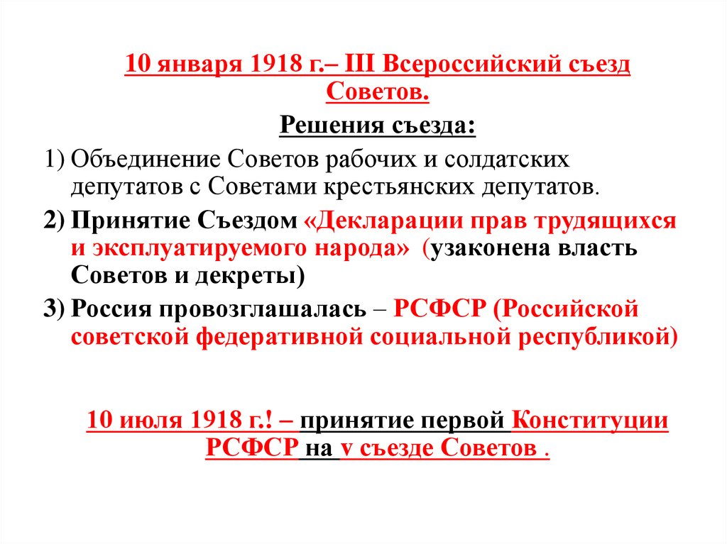 10 января 1918 г.– III Всероссийский съездСоветов.