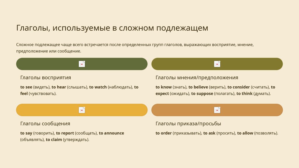 Глаголы, используемые в сложном подлежащемСложное подлежащее чаще всего встречается после определенных групп глаголов, выражающих восприятие, мнение,