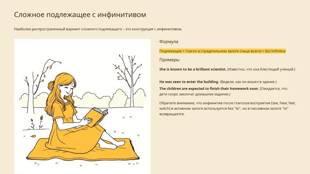 Сложное подлежащее с инфинитивомНаиболее распространенный вариант сложного подлежащего – это конструкция с инфинитивом.