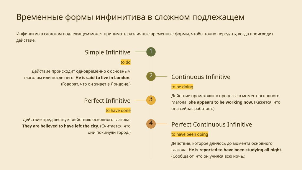 Временные формы инфинитива в сложном подлежащемИнфинитив в сложном подлежащем может принимать различные временные формы, чтобы точно передать, когда происходит