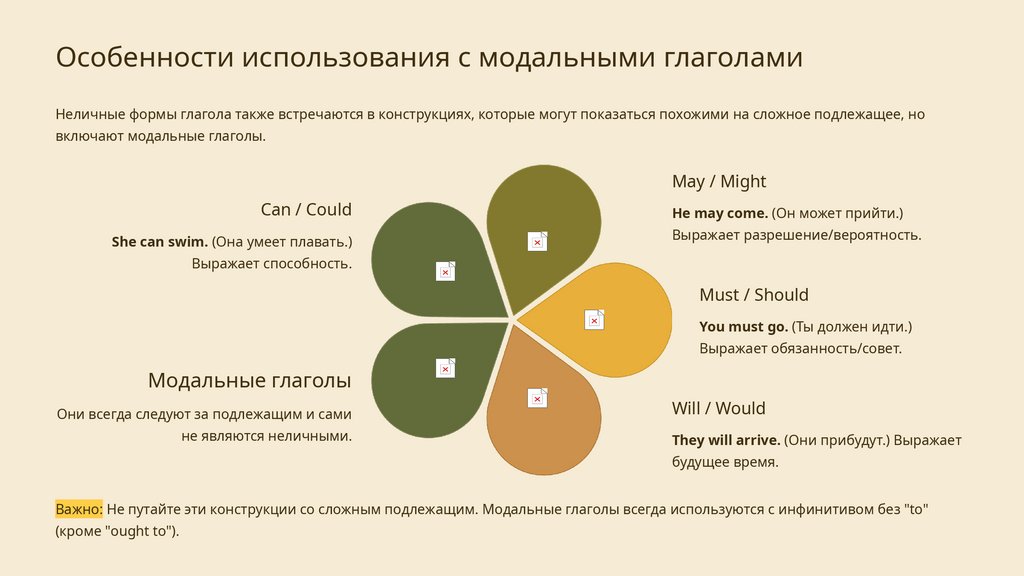 Важно: Не путайте эти конструкции со сложным подлежащим. Модальные глаголы всегда используются с инфинитивом без "to"