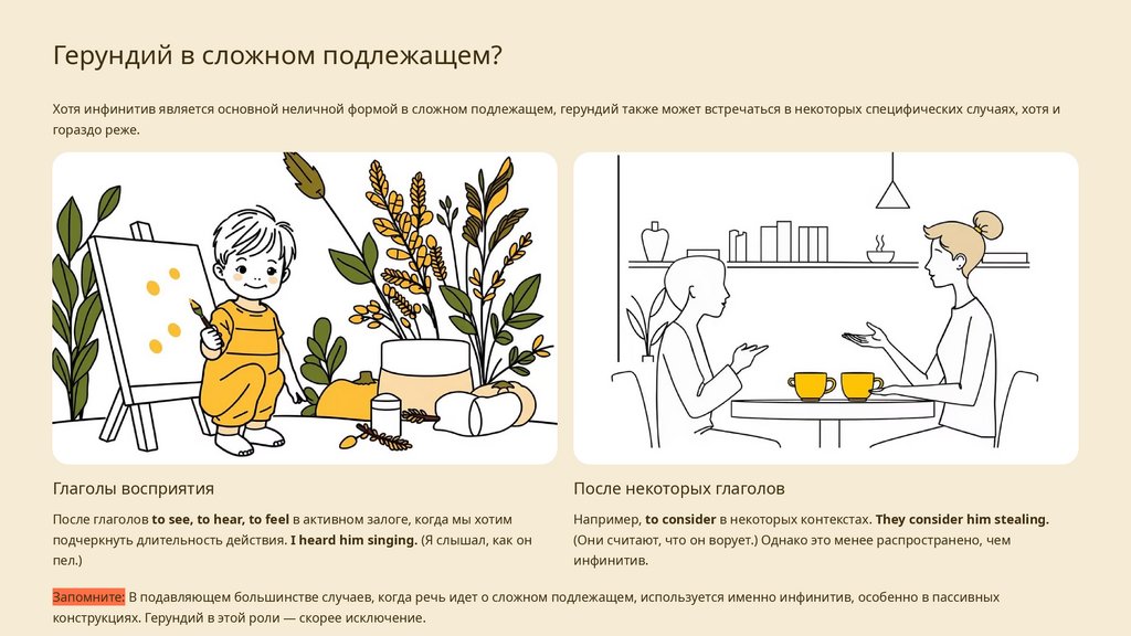 Герундий в сложном подлежащем?Хотя инфинитив является основной неличной формой в сложном подлежащем, герундий также может встречаться в некоторых специфических случаях, хотя и