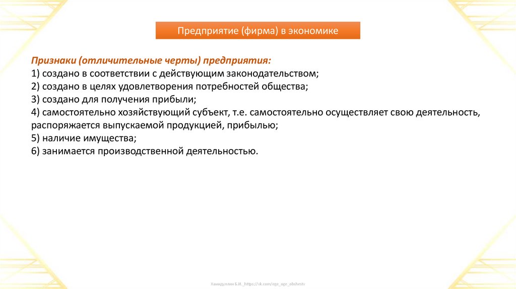 Предприятие (фирма) в экономикеПризнаки (отличительные черты) предприятия: