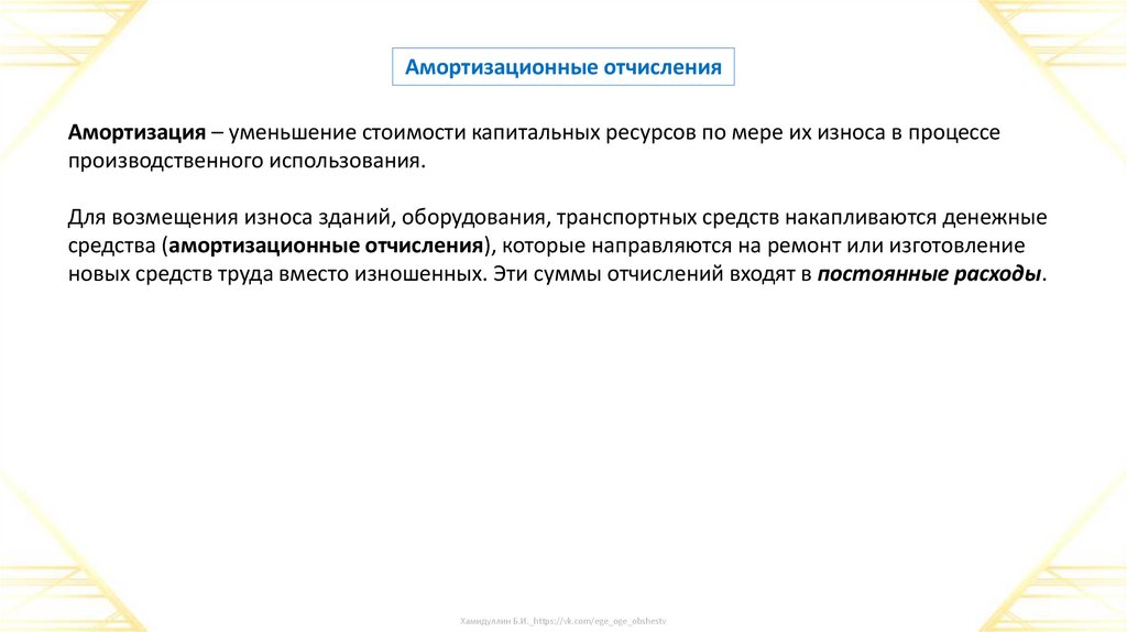 Амортизационные отчисленияАмортизация – уменьшение стоимости капитальных ресурсов по мере их износа в процессе