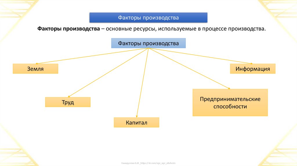 Факторы производстваПроизводство – организованный людьми процесс создания продуктов (изделий и услуг),