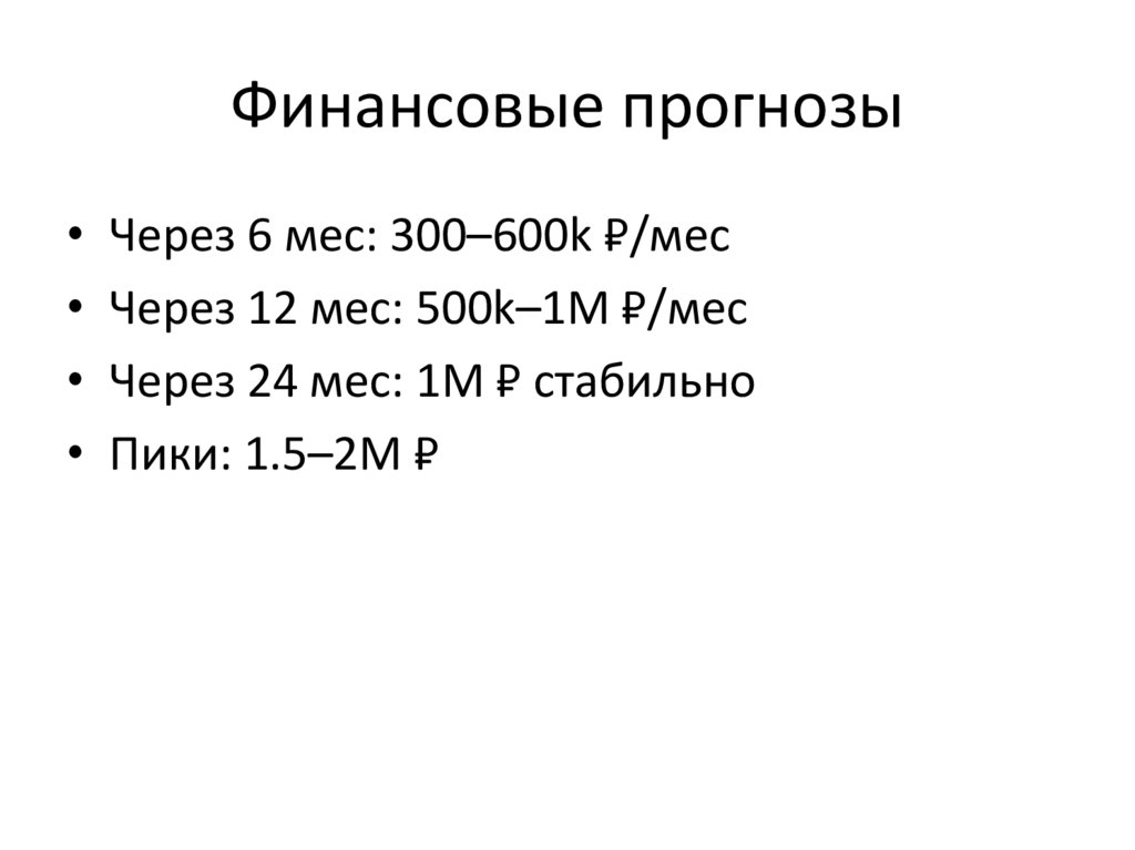 Финансовые прогнозы• Через 6 мес: 300–600k ₽/мес