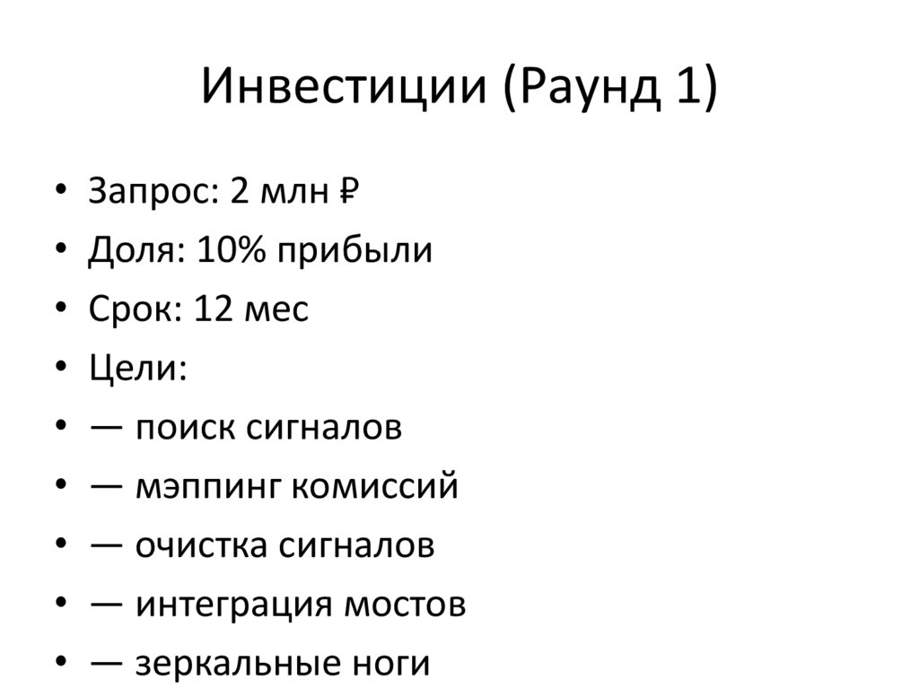 Инвестиции (Раунд 1)• Запрос: 2 млн ₽