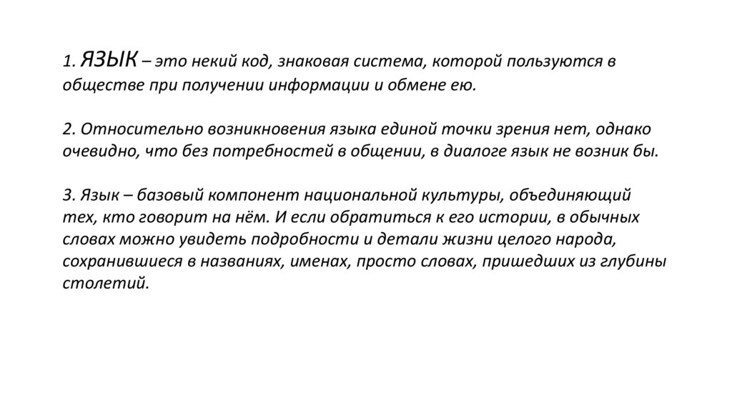 1. ЯЗЫК – это некий код, знаковая система, которой пользуются вобществе при получении информации и обмене ею.