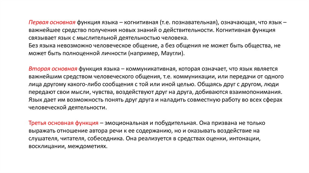 Первая основная функция языка – когнитивная (т.е. познавательная), означающая, что язык –важнейшее средство получения новых знаний о действительности. Когнитивная функция