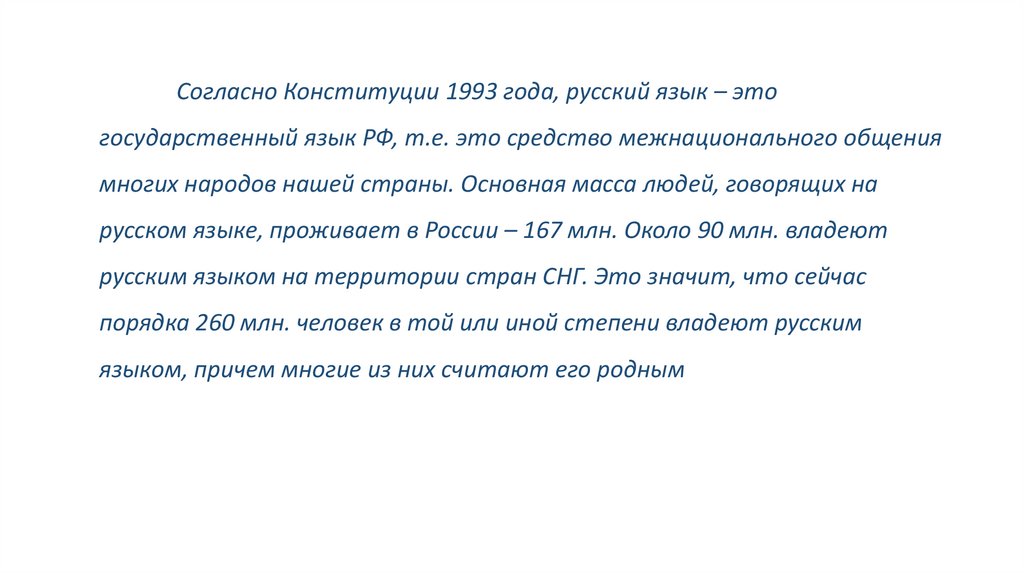 Согласно Конституции 1993 года, русский язык – этогосударственный язык РФ, т.е. это средство межнационального общения