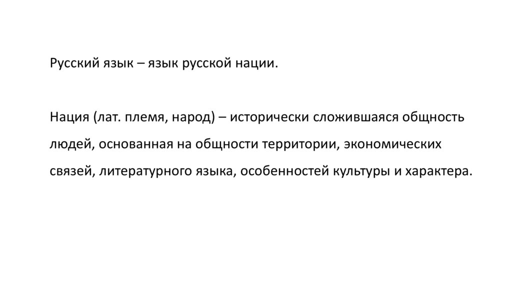 Русский язык – язык русской нации.Нация (лат. племя, народ) – исторически сложившаяся общность