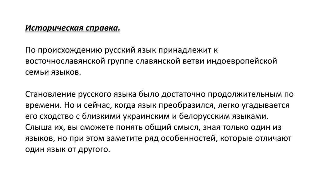 Историческая справка.По происхождению русский язык принадлежит к