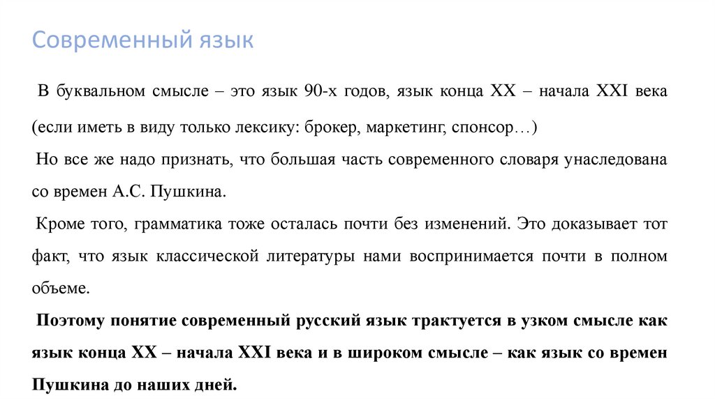 Поэтому понятие современный русский язык трактуется в узком смысле как