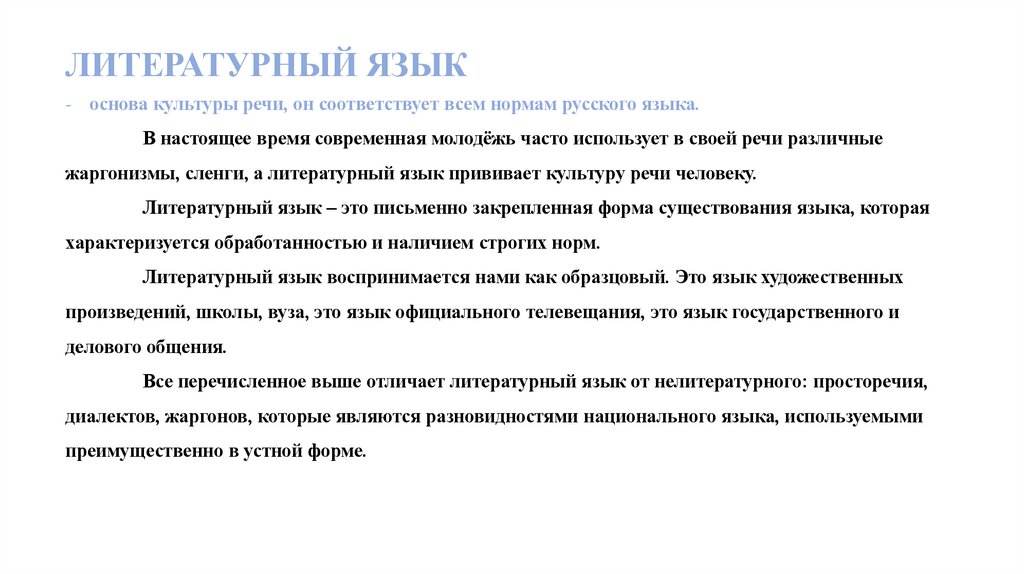 ЛИТЕРАТУРНЫЙ ЯЗЫК- основа культуры речи, он соответствует всем нормам русского языка.