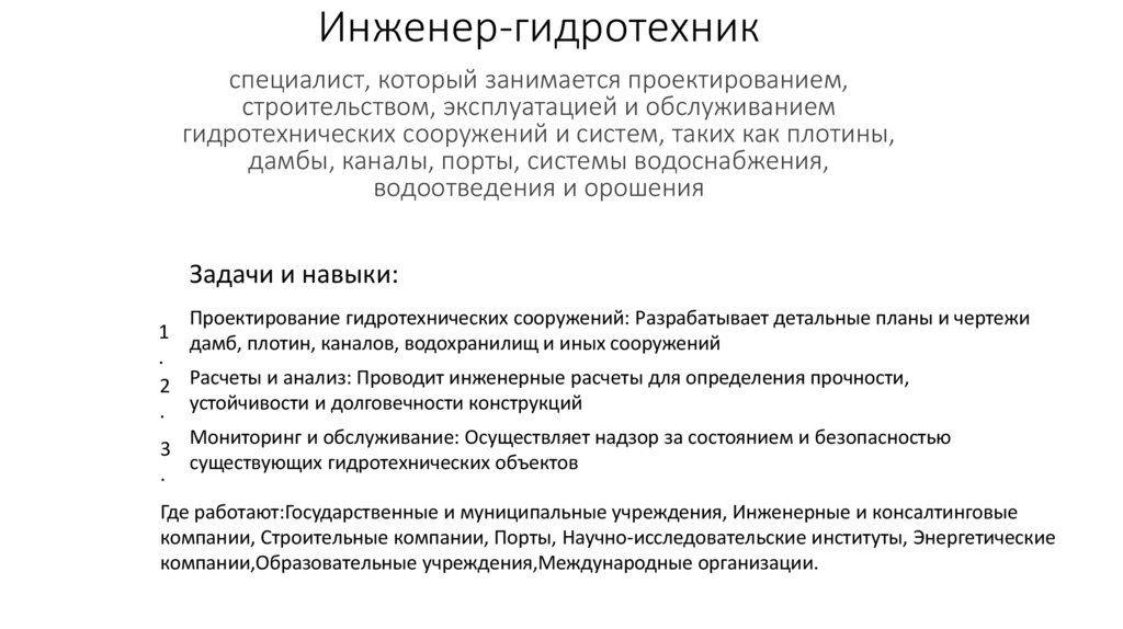 Инженер-гидротехникспециалист, который занимается проектированием,