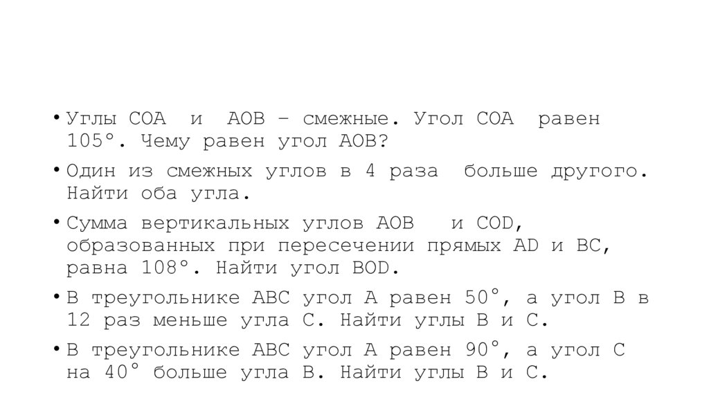 • Углы СОА и АОВ – смежные. Угол СОА равен105º. Чему равен угол АОВ?
